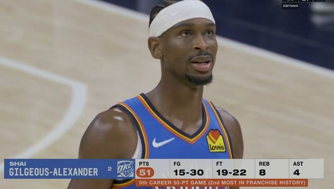 这场比赛亚历山大一个人疯狂爆轰55分创造个人得分新高,血战双加时出手了31次,虽然有16个打铁,但是也进了15个球,关键是罚球太多了,26罚23中拿了55分8板5助2断,这真是有点厉害,而且看亚历山大有多强,你光看他的罚球数量你是看不出来的。